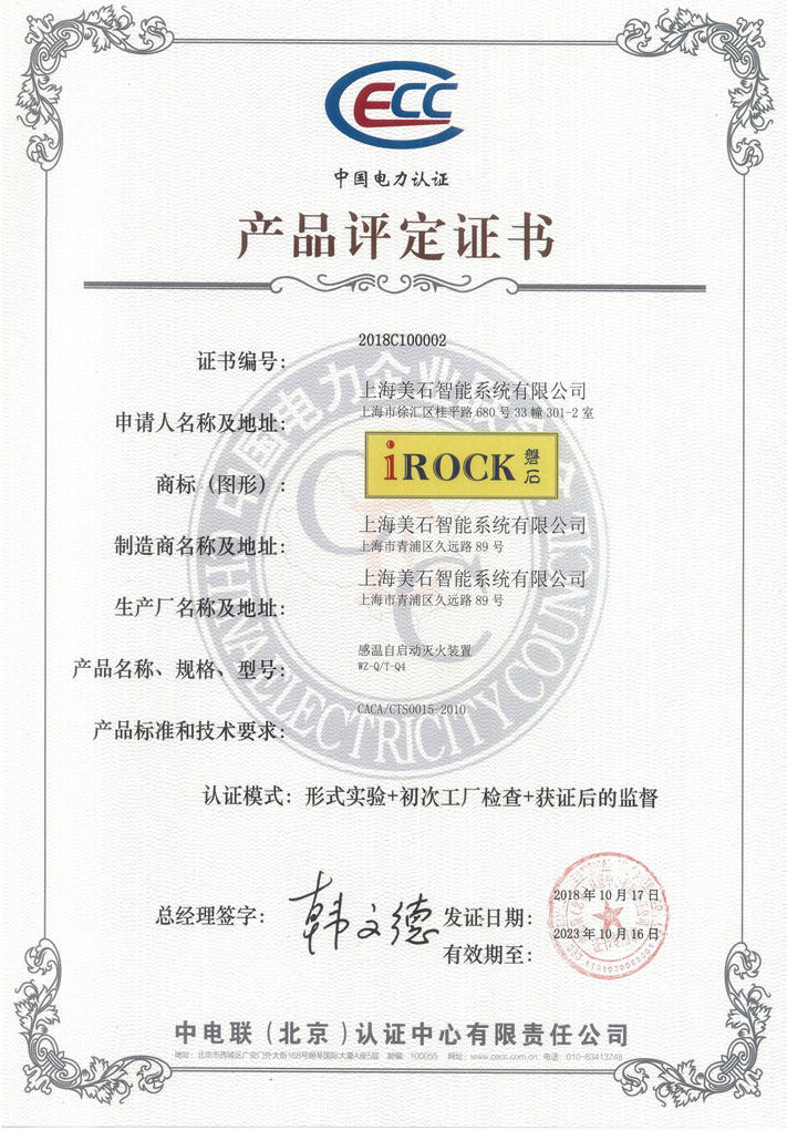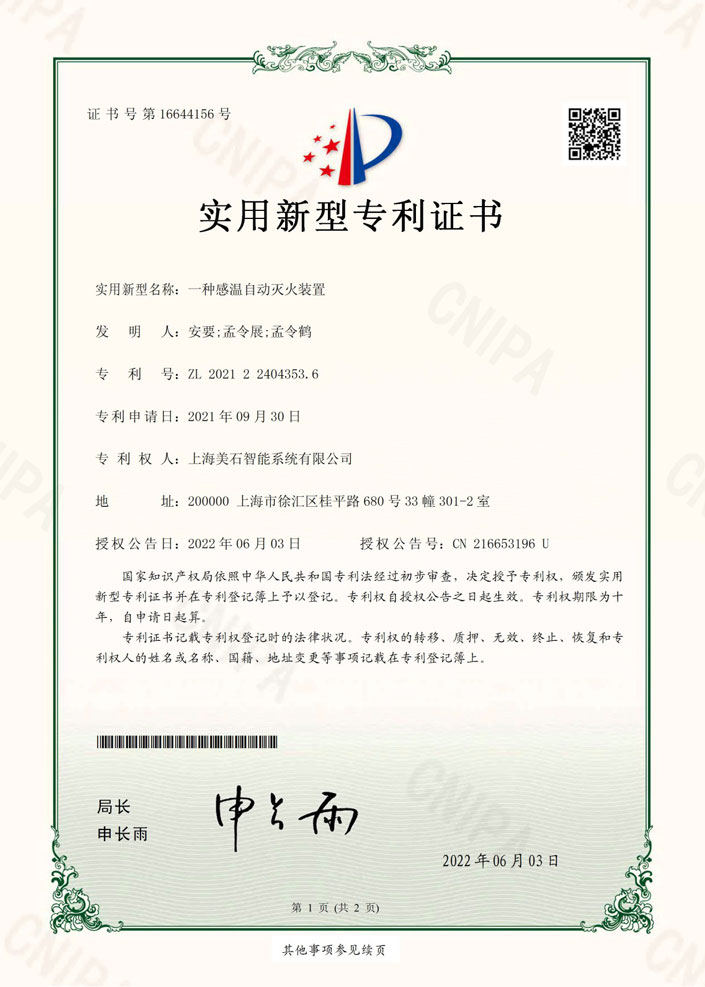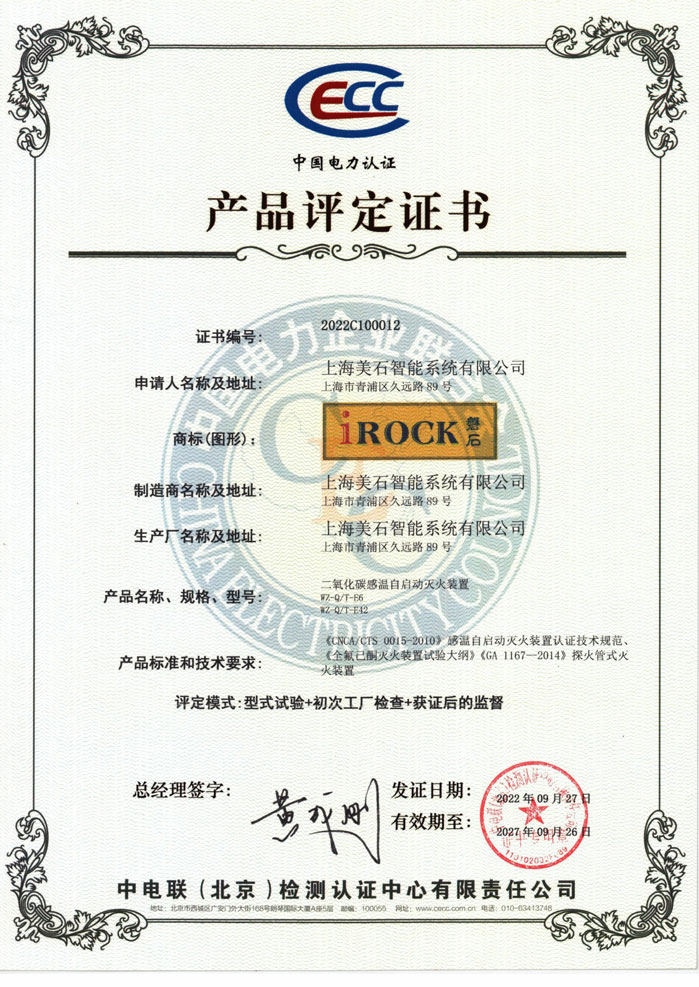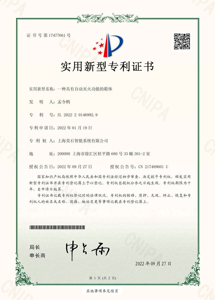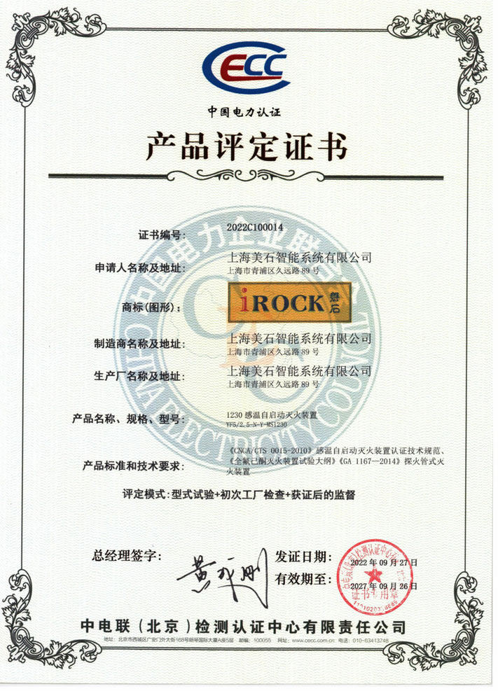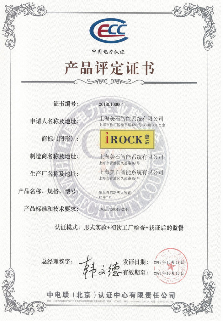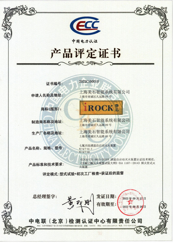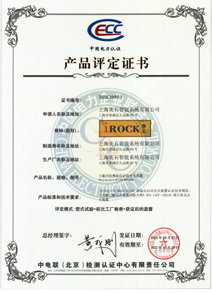 上海美石智能系统有限公司专注于研发制造的“iROCK磐石”系列感温自启 动灭火装置。技术、销量一直处于行业领先。产品集探火、报警、灭火为一体的新型灭火装置,是一套操作简单、低成本且高度可靠的独立自动灭火系统, 解决了困扰消防行业已久的,对储能仓、户外柜、数据中心机柜、电气设备、 各类控制箱、配电柜、易发生火患的空间的防火问题。