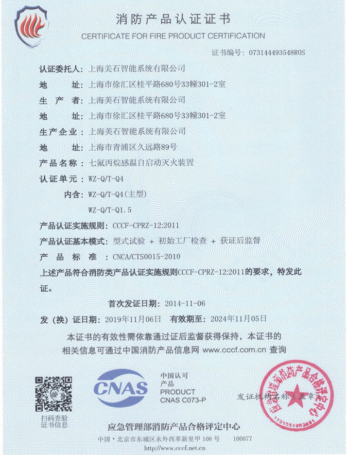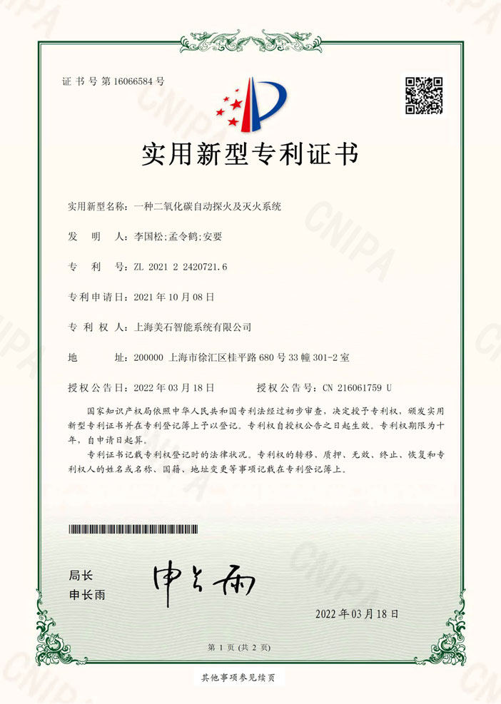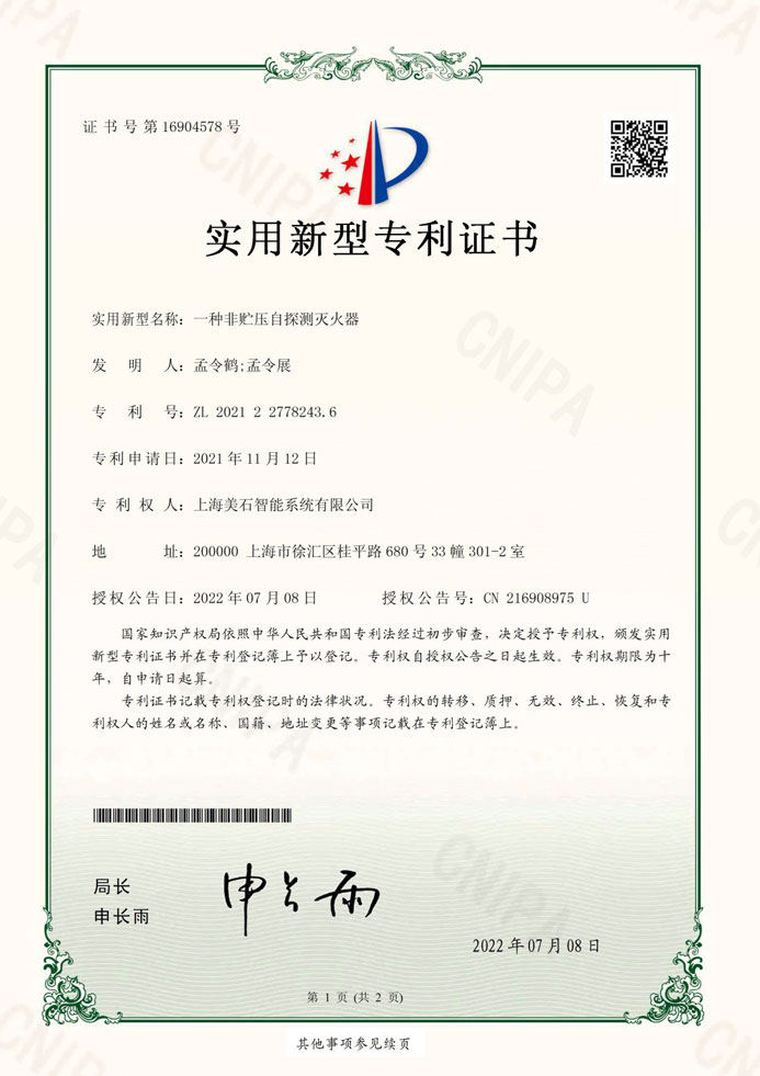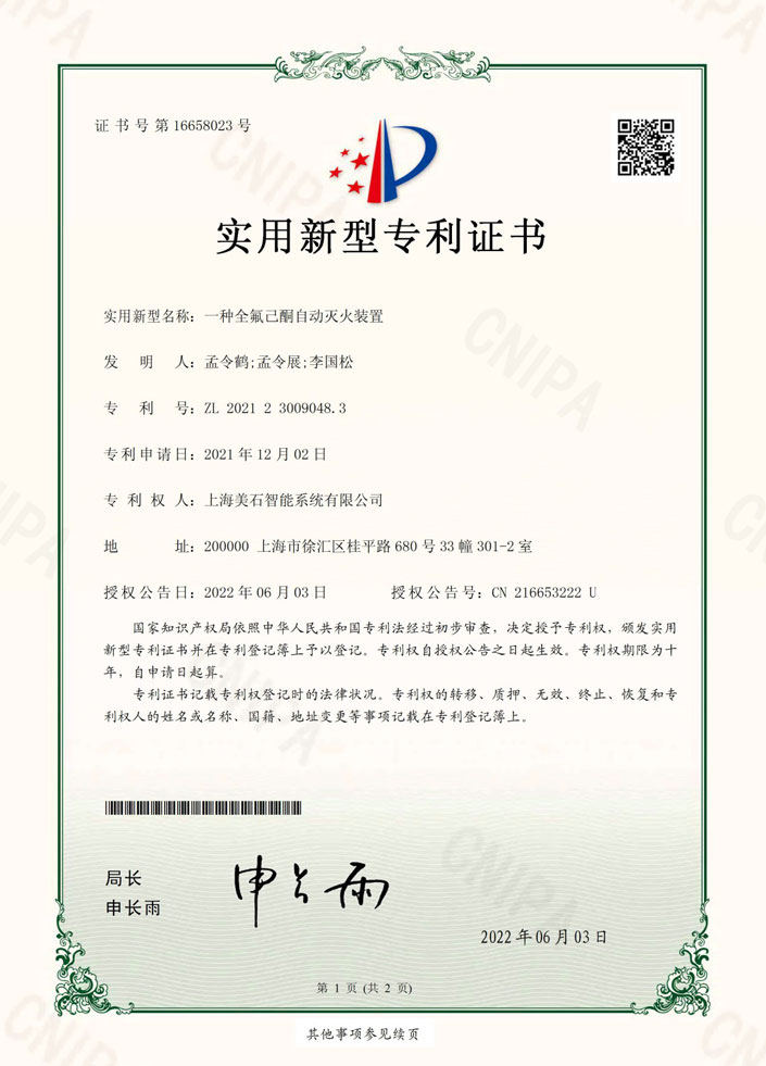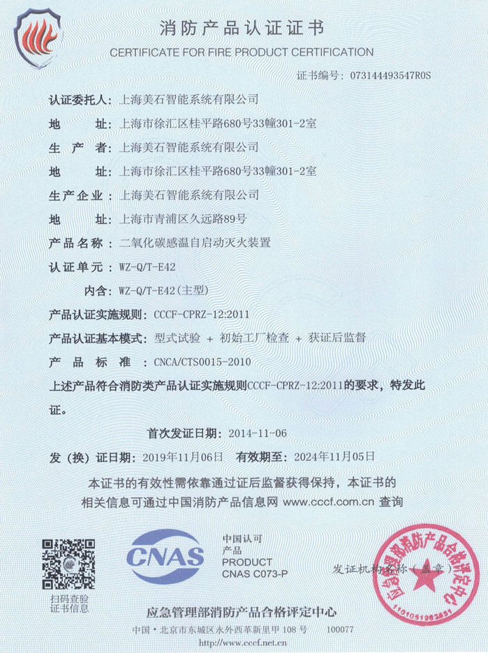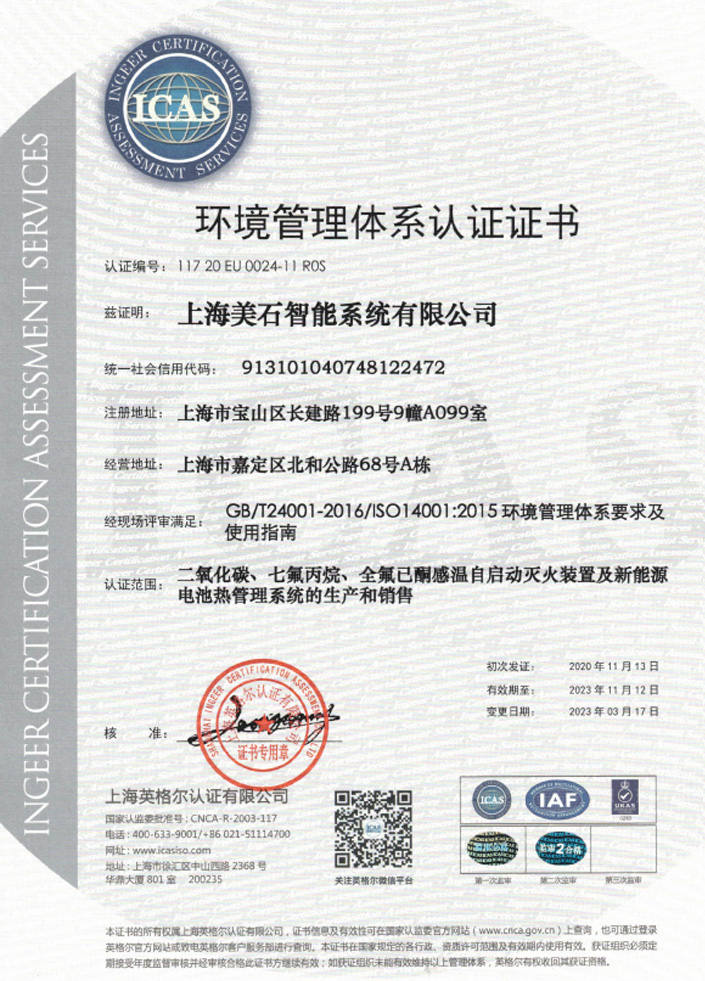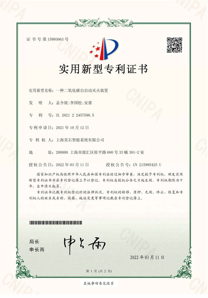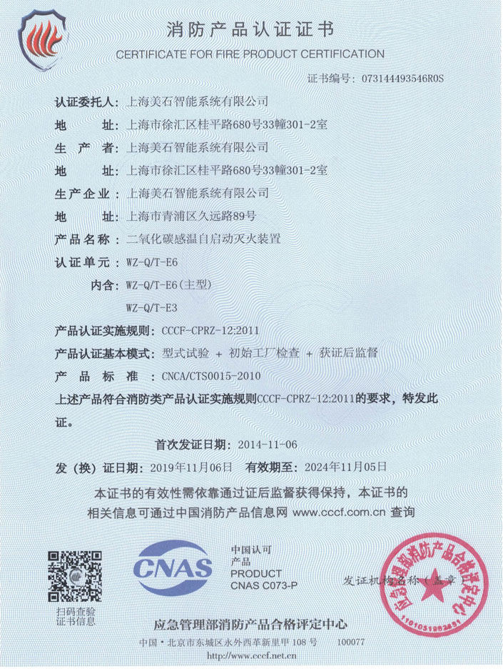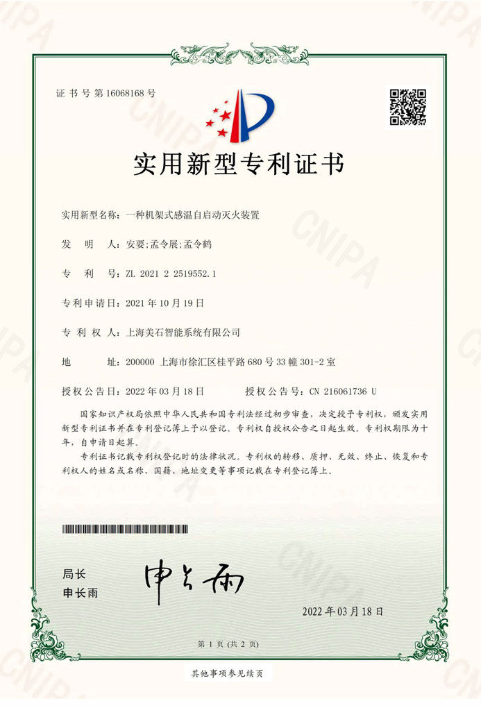 上海美石智能系统有限公司专注于研发制造的“iROCK磐石”系列感温自启 动灭火装置。技术、销量一直处于行业领先。产品集探火、报警、灭火为一体的新型灭火装置,是一套操作简单、低成本且高度可靠的独立自动灭火系统, 解决了困扰消防行业已久的,对储能仓、户外柜、数据中心机柜、电气设备、 各类控制箱、配电柜、易发生火患的空间的防火问题。