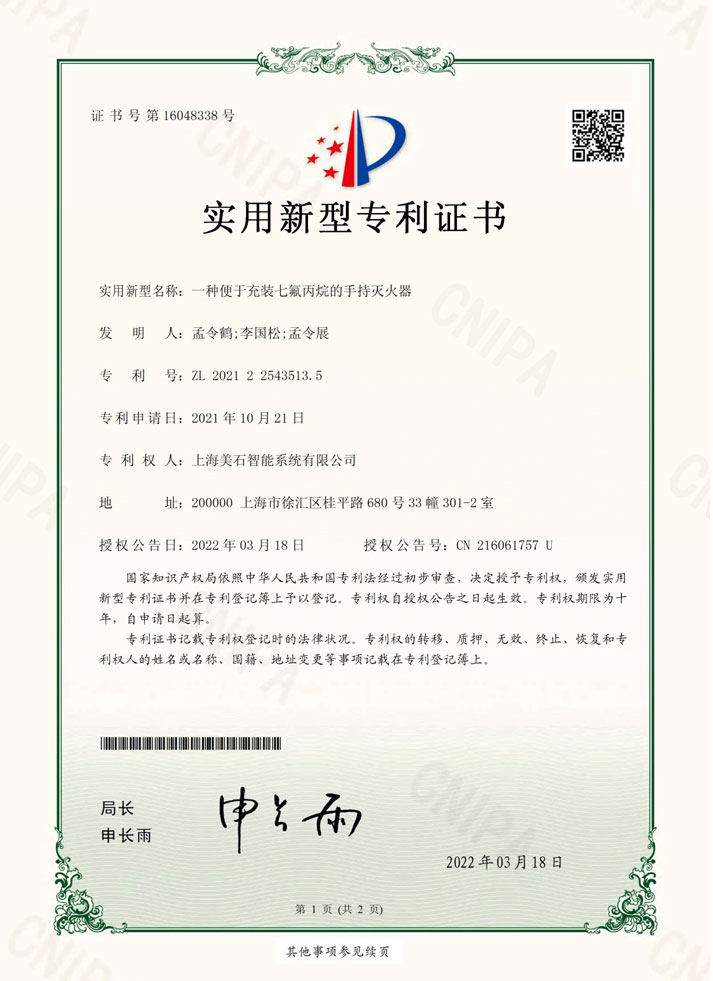 公司从2013年成立以来,一直把消防产品研发和科研放在首位,同东华大 学、上海交大、河南科技大学、南方电网、华电集团共同研发多种环境场景实 用技术,致力于狭小空间消防安全保护并且已经在产品创新方面做出大量科研 成果。公司研发的防泄露无线智能巡检自动灭火系统,使系列灭火系统智能 化,网络化,达到国内及国际先进水平。产品已通过“国家固定灭火系统和耐火 构件质量监督检验中心”、“国家消防装备质量监督检验中心”的检测及“应急管 理部消防产品合格评定中心”(CCCF)认证。取得了中国电力消防产品(CECC)认