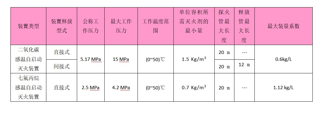 两种探火管灭火装置根据灭火剂的不同在型号上也是有差别的,现行主要的灭火剂有七氟丙烷灭火剂以及二氧化碳灭火剂,因此也造成了灭火剂不同的充装量,相对来说七氟丙烷的充装量比二氧化碳的充装量少,在贮存压力以及泄放压力都有所差别,详情如下图所示: