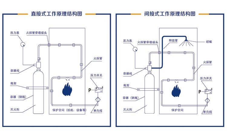 探火管自动灭火装置分为两种灭火方式,分为直接式灭火与间接式灭火,是两种不同的探火管灭火装置。这两种探火管灭火装置在灭火原理、参数、型号以及使用场所都有明显的区别,很多客户都不清楚怎么区分这两种探火管灭火装置以及对其进行选型,下面根据两种装置的主要差别进行对比。