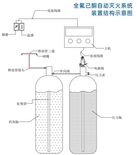 系统工作原理是将全氣己酮灭火剂以液态贮存于容器内,依靠其本身的饱和蒸气加压对本身进行加压,即其贮存压力仅为灭火剂的饱和蒸汽压力,而作为灭火剂喷放动力的压缩气体则以较高的压力贮存在其它的容器内。系统工作时,高压驱动气体减压后注入灭火剂贮存瓶中,驱动灭火剂进入保护区实施灭火。
