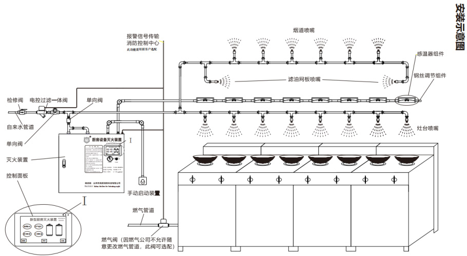 通过温感探测,温度达到一定高度时,火灾信号传输给控制瓶阀门控制瓶阀门打开,灭火药剂通过释放管,喷嘴直接释放到锅内,当药剂释放完毕后,水系统自动打开喷射到油锅及烟罩内,使温度降低。